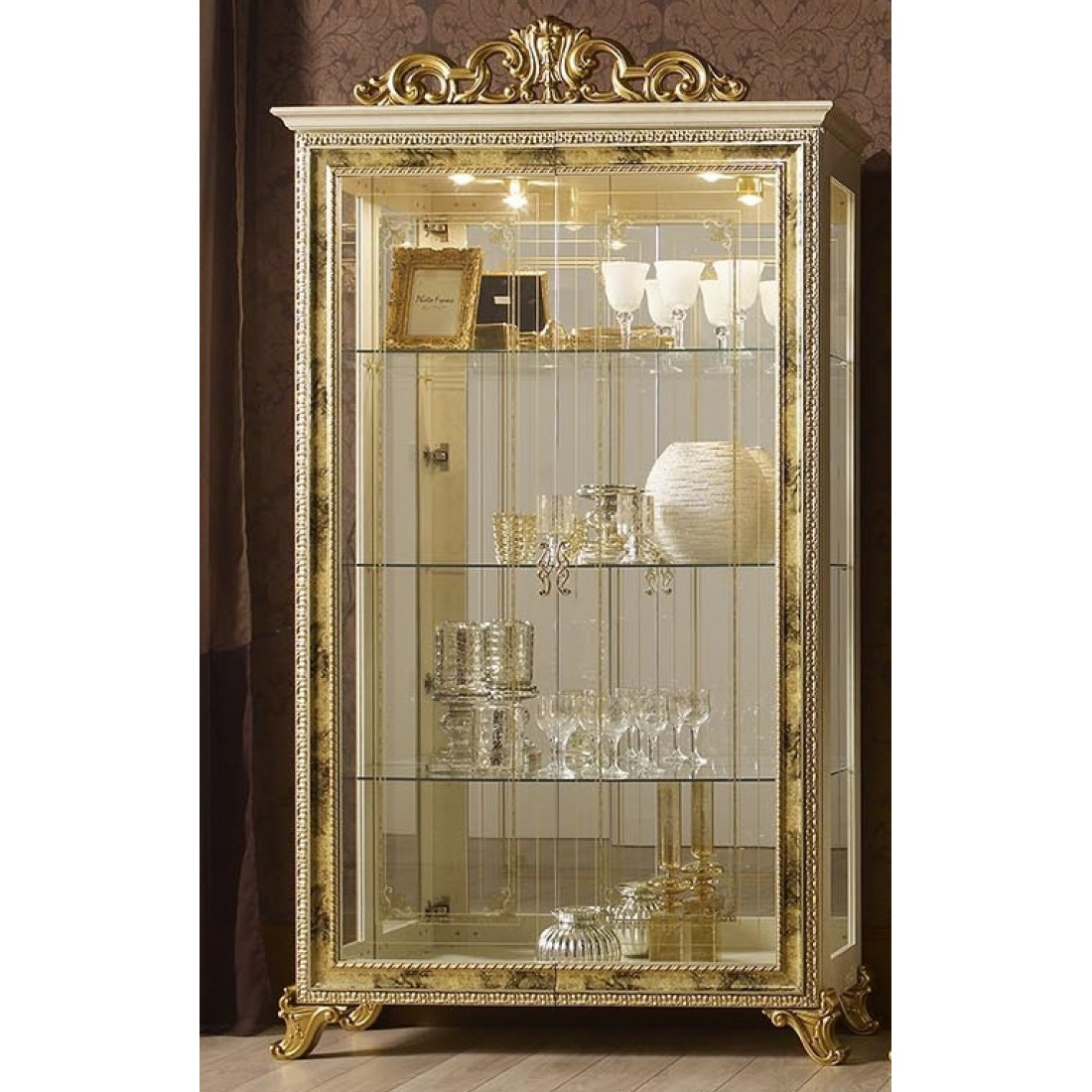Шкаф-витрина двухдверная Катя (беж) - выполнена в классическом стиле от Российской фабрики "ДИА мебель". Большие стеклянные полки и корпус из зеркала придаст чувства легкости и визуально поможет расширить комнату. Выполнена в бежевом цвете с элементами позолоты на фасаде. Такая шкаф-витрина будет не заменима для маленькой гостиной и удивит Вас своей многофункциональностью.