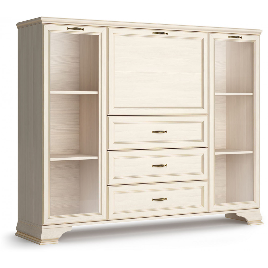 Коллекция производится в текстуре «бодега белый» с эффектом золотого патинирования. Облик «Сиены» дополняют рамочные фасады и карниз в классическом стиле, а также эффектные опоры из МДФ. Мебель комплектуются металлической лицевой фурнитурой премиум-класса в цвете «старая бронза» и надежной крепежной фурнитурой.