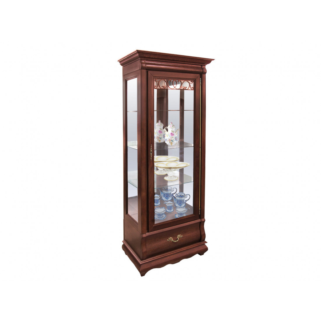 Классический шкаф с витринным стеклом из коллекции мебели для гостиной "Оскар" отличается высокими карнизами и плавными изгибами форм. Стекло витрины с фацетом и оригинальным растительным узором, выдвижной ящик на направляющих. Модель выполнена с использованием массива дуба и окрашена в оттенок "Орех". Дверца открывается влево.