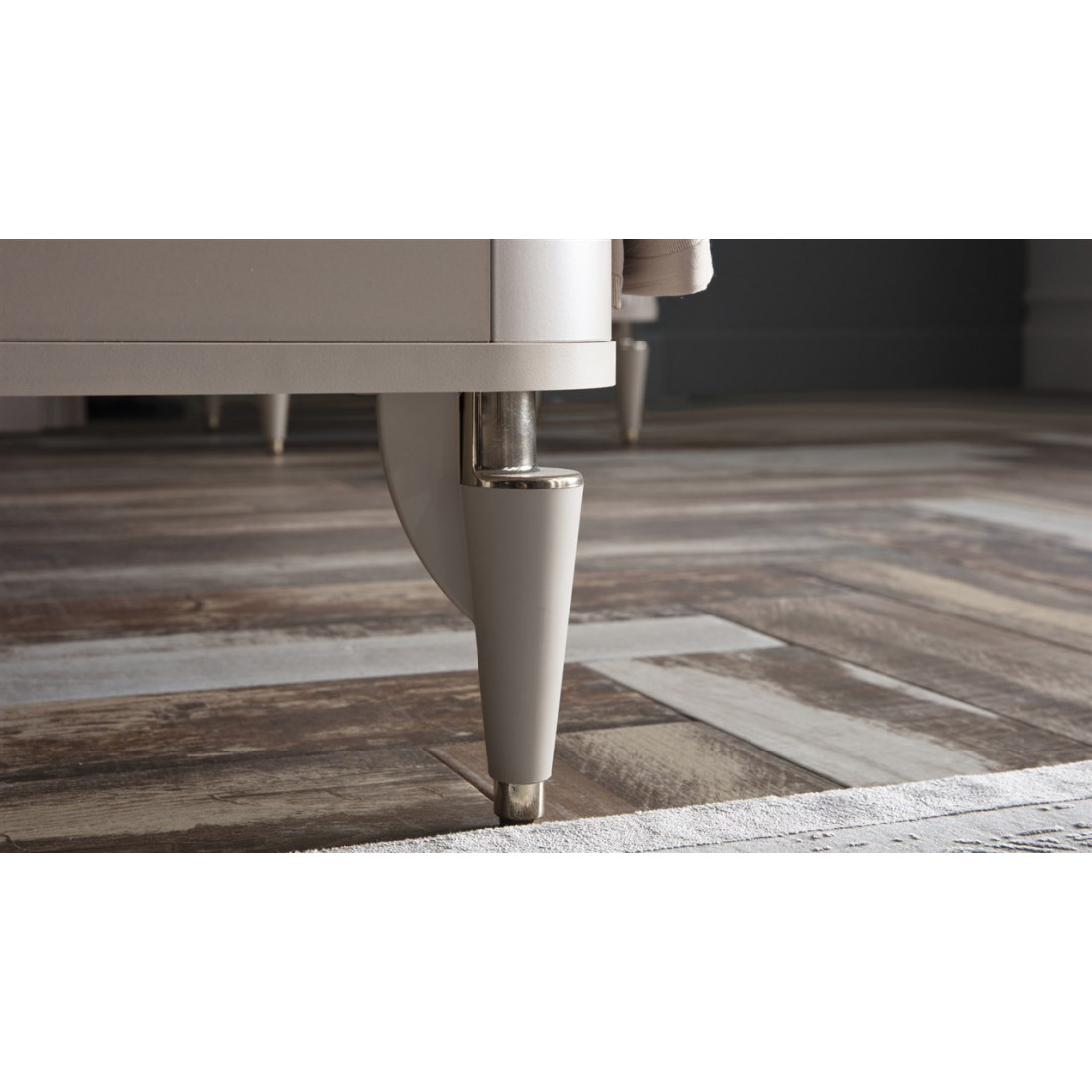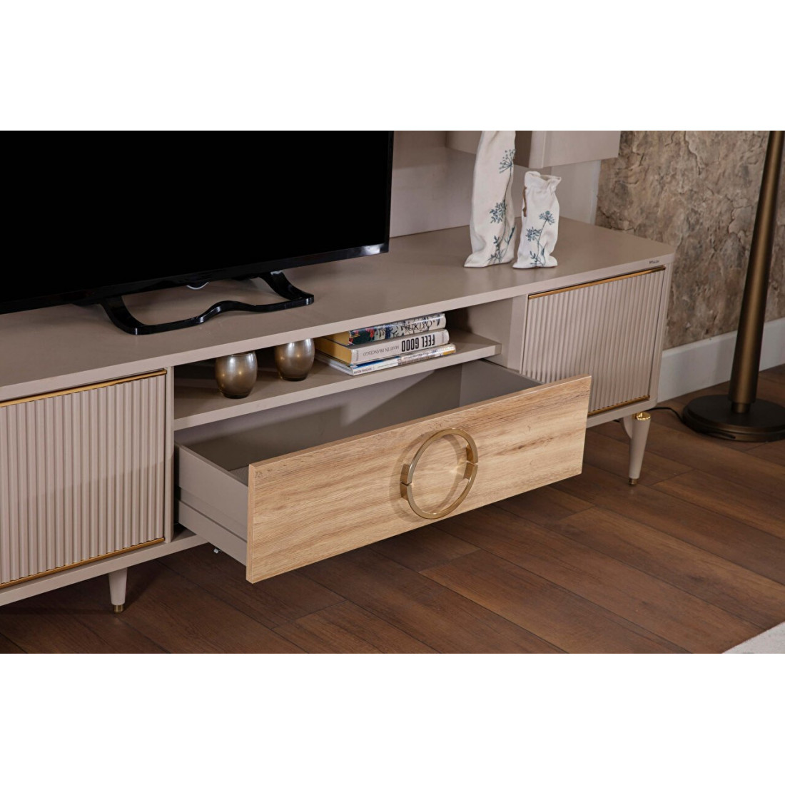 Тумба под ТВ Санвито SANVITO SANV-15  от турецкого производителя Bellona выполнена в современном стиле. Она отлично впишется в интерьер вашей гостиной. Позволит разместить большую плазму или домашний кинотеатр. Негромоздкая, утонченная по своему дизайну, тумба офрмлена в теплых, светлых тонах кремового оттенка в сочетании древесной фактуры. Боковые фасады декорированы по периметру золотой каймой, а центральный ящик круглой металлической ручкой. Как и другие элементы данной коллекции, кремовые фасады имеют рифленую поверхность, а уголки тумбочки закруглены.